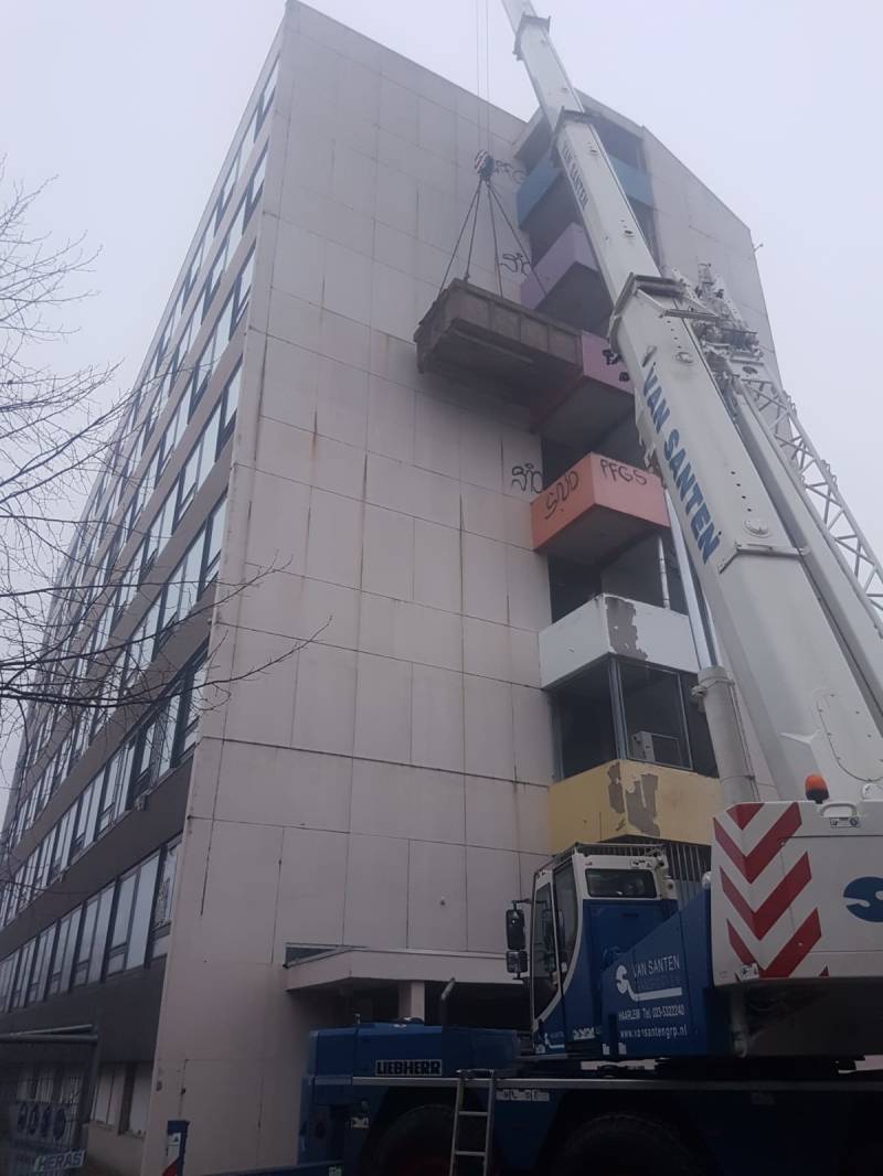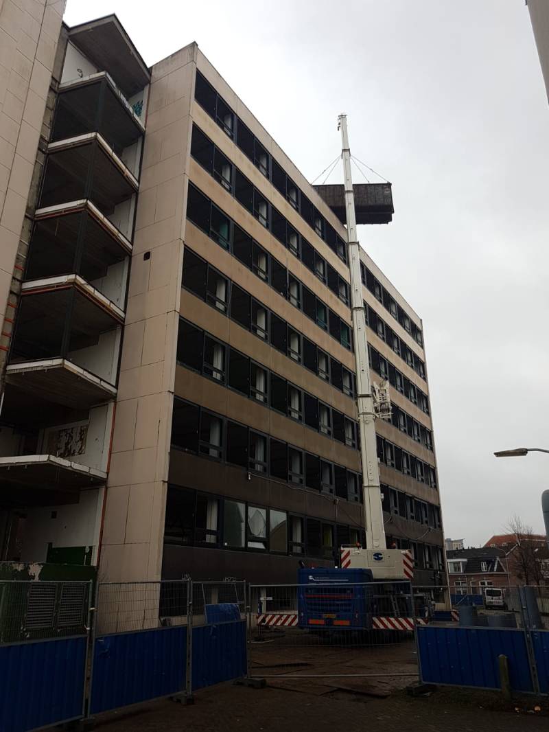 De asbest werkzaamheden van de grootschalige sloop van Koningstein te Haarlem zijn afgerond. Zoals te zien op de afbeelding zijn daarbij de asbesthoudende delen uit het pand gehesen.